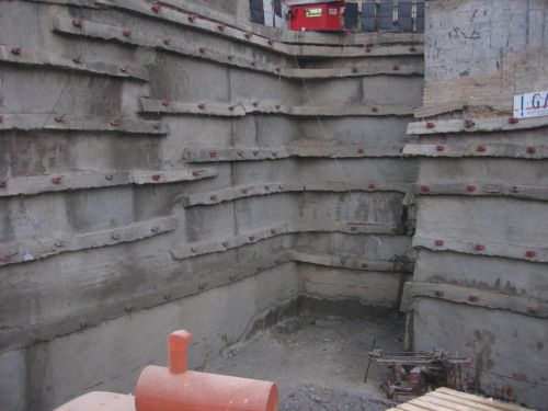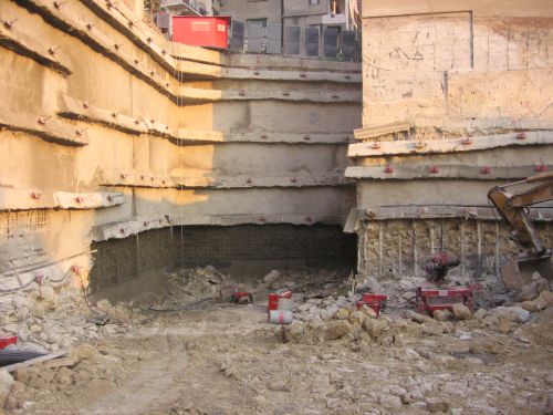 The backside wall of the Municipality Building in Hazmieh required to be nailed and shotcreted in an architectural way. As well as the main road had to be retained to permit the excavation to go deeper. The soil consists of clay material.  Int’l I.G.M. designed and constructed the two separate portions of shoring system consisting of micro piles and anchors with a shotcrete wall, and also does all the work of retaining of the upper wall by nailing and shotcreting.